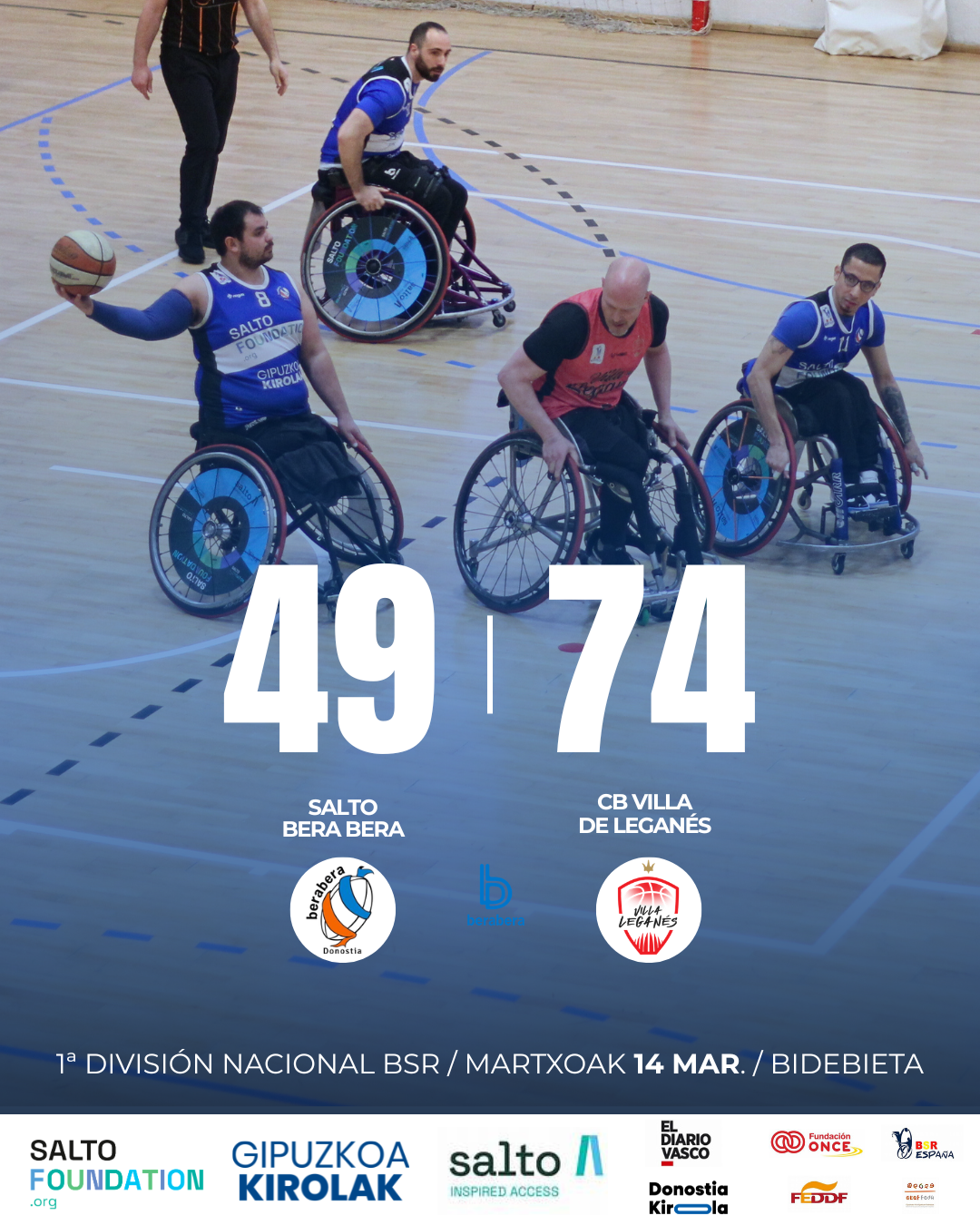 El Salto Bera Bera no pudo superar al CB Villa de Leganés en un partido intenso y muy físico, marcado por el ritmo alto del encuentro y la mayor rotación del conjunto visitante. El equipo madrileño acudió con una plantilla amplia que le permitió mantener la frescura durante todo el choque, un factor que terminó siendo determinante.